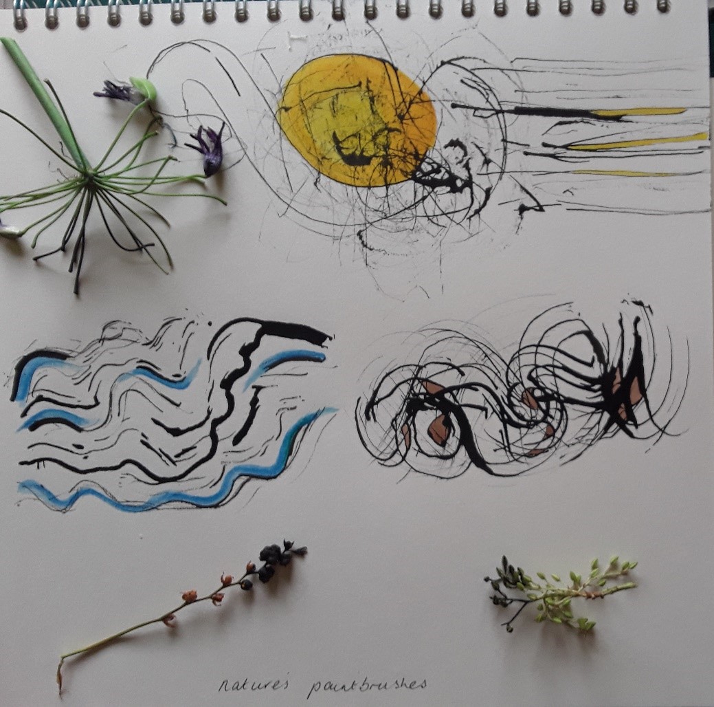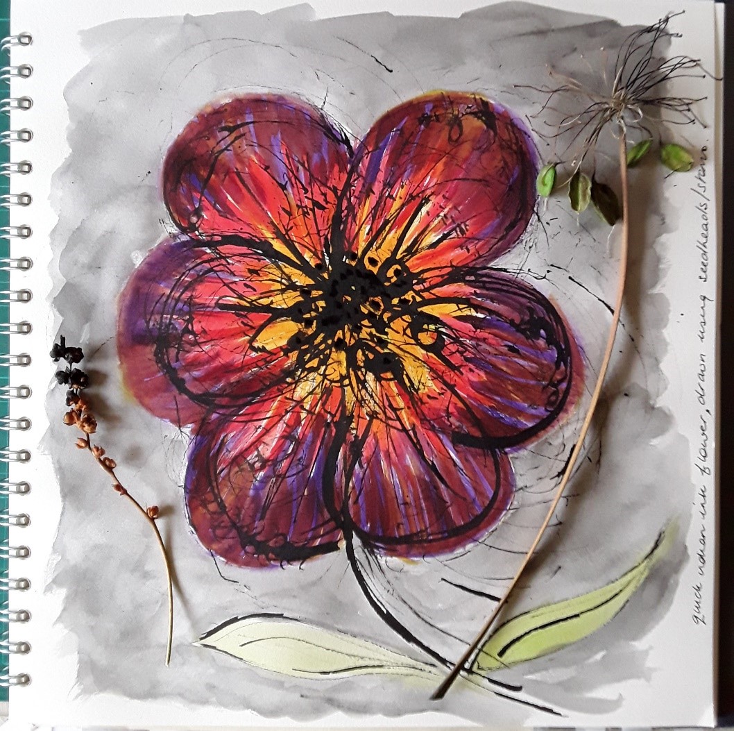 Judith Burnett has brought the garden inside for a bit of inspiration – “playing with seedheads, as brushes, to make marks with Indian ink -and some added colour”.