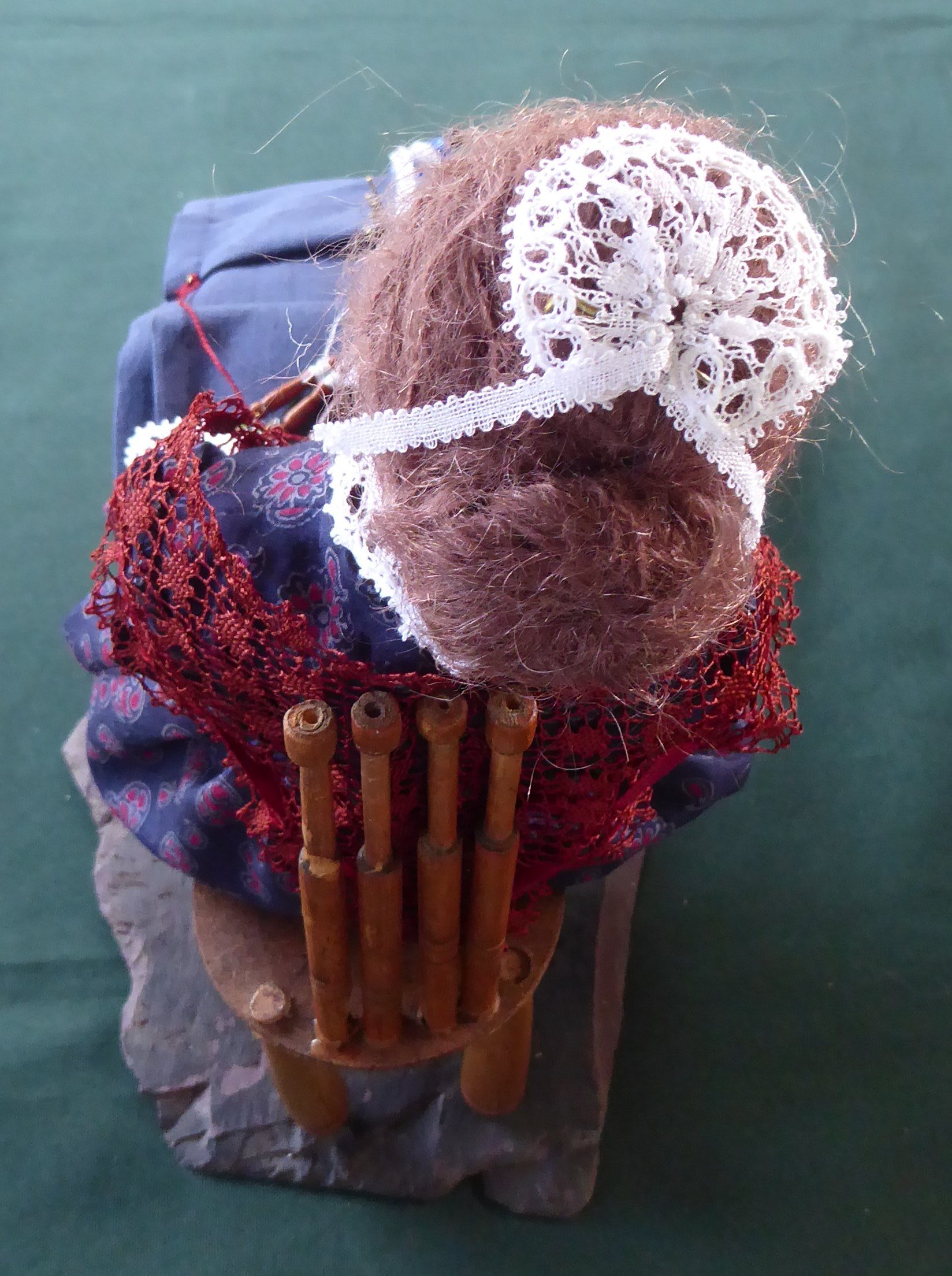 The chair and pillow stand have wooden bobbins as legs and chair back. The pillow is stuffed with paper straw. With only 8 bobbins I have used Kat stitch for the lace on the pillow. The bobbins have been spangled with tiny beads and a thread has been threaded through the spangles and anchored to the pillow to keep the bobbins in order. In Sweden a folkdance forms this stitch by the movements of the dancers. They carry threads that are wound around giant pegs in the ground. The pin cushion is stuffed with emery filings. The pins are fine, small-headed, longer than I would have liked. The heads are too large on the shorter pins used for Bruges lace. I found a piece of slate in my garden to use as a base for the doll.