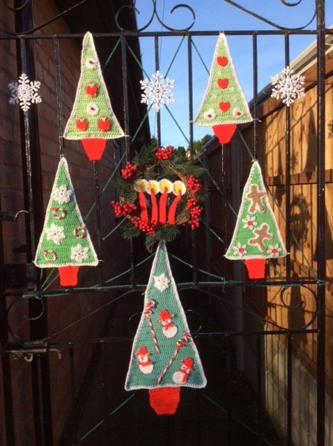 The wind howled and the rain clattered, but the crocheted autumn display clung onto the bars of the wrought iron garden gate and miraculously survived everything October and November threw at it.