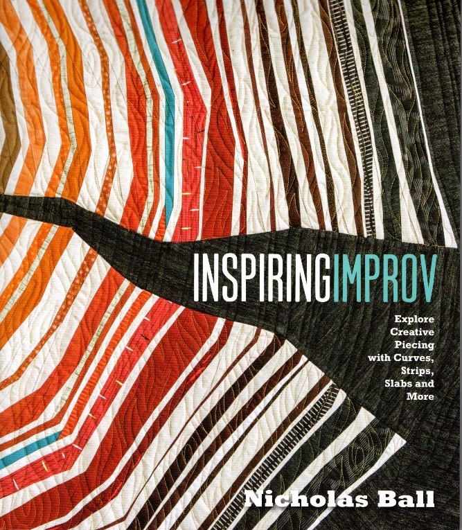 Nick is an Improv quilter – no measuring or rulers, just-go-for-it attitude. Very liberating, EASY and great fun. The project is his quilt Shoals – beautiful sleek silver fish in dark blue water. It’s from his book, see photos below. Improv curves – not tried them before…!