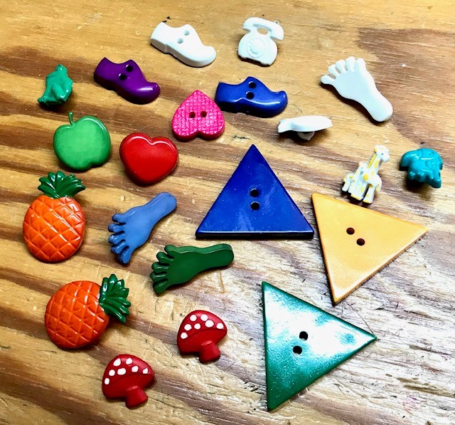 I used to have a wool shop when I lived up North and used to buy novelty plastic buttons “in the white” from a lovely old man in London’s East End. I would dye them at home on the kitchen stove, with Dylon dyes, then paint details on them. I had pineapples, strawberries, palm trees, all sorts of shapes which I sold in the shop during the ‘80s. Sadly I have very few left…