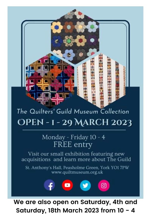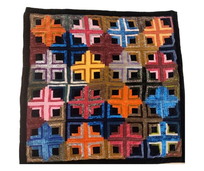 A trip to York would not be complete without a rare chance to see the quilts held by the Quilters’ Guild at their HQ. The Guild are opening their doors to the public in March showing a mini exhibition of recently acquired items to their Quilt Collection. One of the latest treasures on display is pictured above. Here you can see a vibrantly coloured velvet Log Cabin Coverlet from the early 20th century, which uses embossed and printed plush velvet fabrics. The log cabin blocks are arranged in the ‘Sunshine and Shadow’ layout, and it was made by one (or more) of four Sutherland sisters who were born at Skerpie farm in Burray, Orkney Islands.