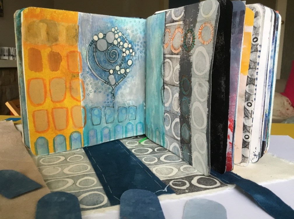 Last month I mentioned that I was doing a Crafty Monkies Sketchbook course with Gary Mills. It’s just a 3 part, 90 minute boost-your-creativity course, and you don’t work in sketchbooks at all! Gary has you work fast, so you don’t get time to ponder, you just belt out ideas and mix colours and get them down on pages and scraps. You get the videos to access later. For the colour module we turned all our mad scrappy pages into long rolls of collaged bits, which looked great when finished. I really liked his accessibility and simple approach. The next module is Collage Doodles. Can’t wait. All are available via Crafty Monkies, and you can access the recordings if you can’t join live.