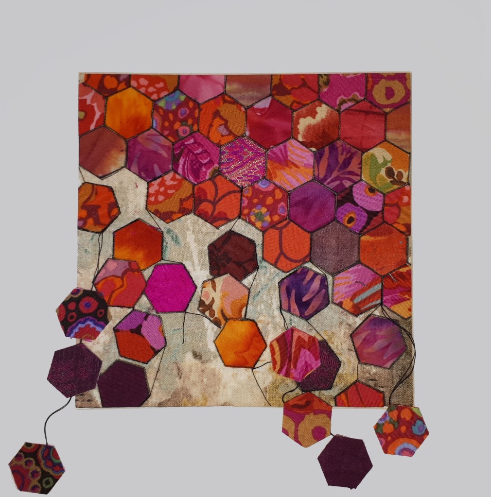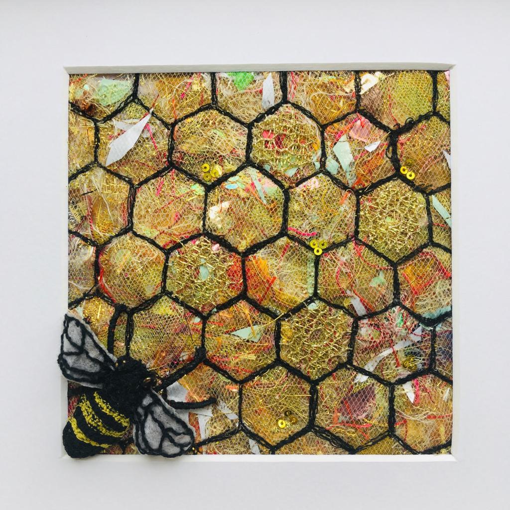 Having recently read ‘The History of Bees’ by Marja Lunde the idea of the fragility of life…especially at this particular time, seemed a really appropriate starting point for Nature’s Architecture. Like the bees buzzing around collecting nectar, building stores to create honey, we, as textile artists, travel through life collecting info and treasures to build our own creations. As Lunde suggests if the bees were denied their architecture of pollination life would cease to exist.