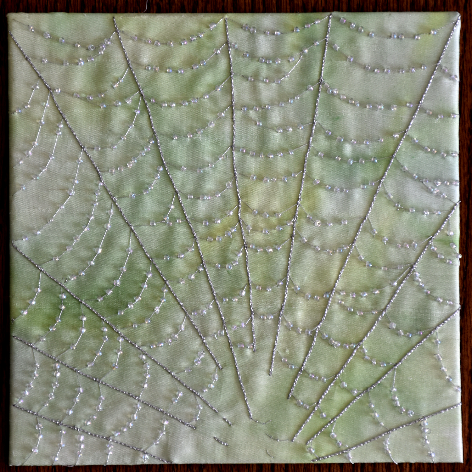 The work is hand dyed and painted silk with silver threads in various thicknesses and tiny beads for the raindrops.