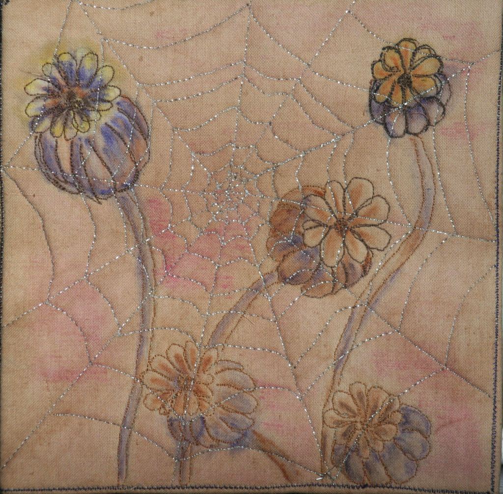 I wanted to use a set of Inktense crayons that I’ve had forever and never used on fabric. I had also been looking through some old photographs and came across some photographs of cobwebs with the image of poppy seedheads behind them and was inspired!!