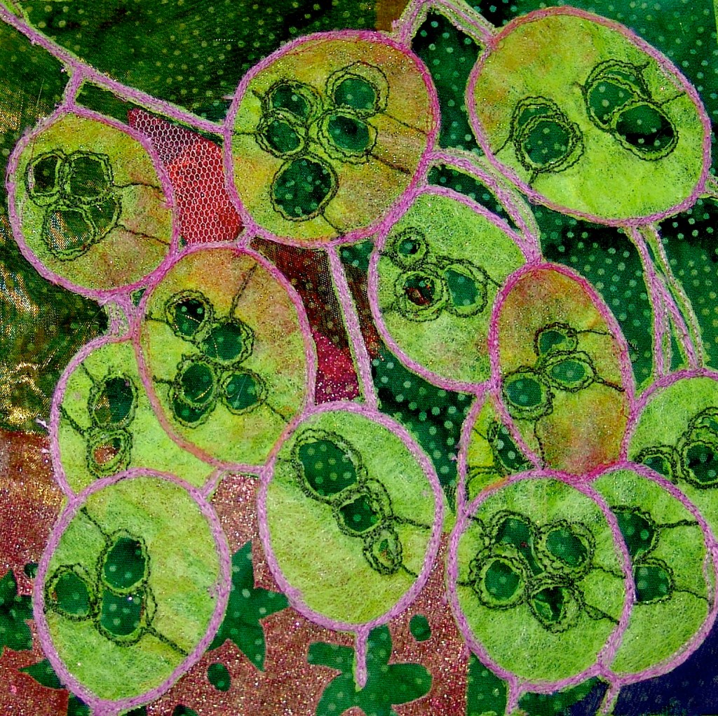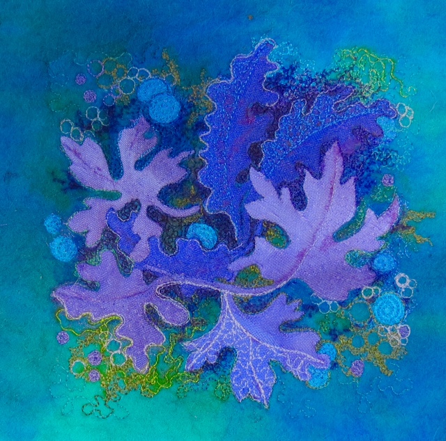 I used free machining to define the plant and then cut away the background and replaced it with a collage of different pieces of organza on a printed cotton fabric.