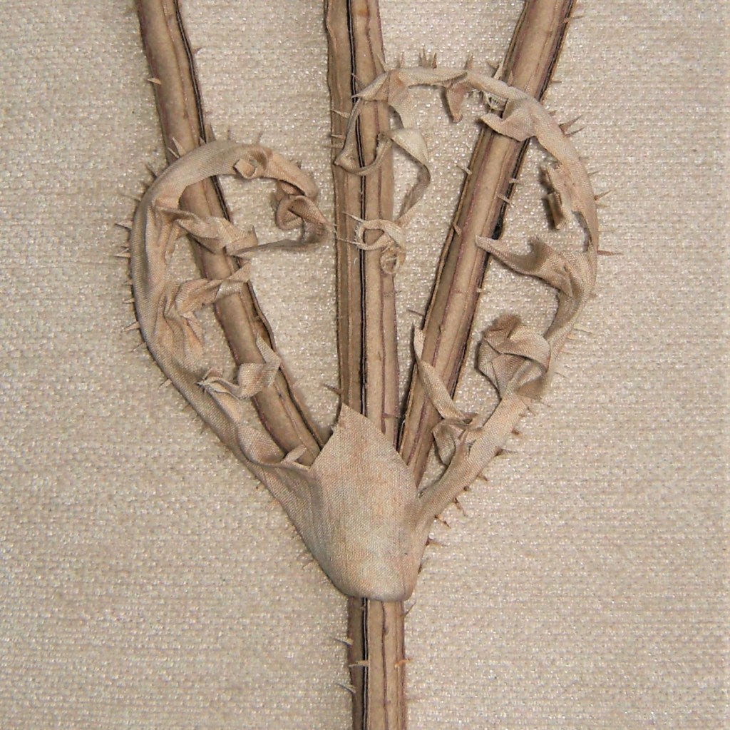 The components are actually a piece of work I did a number of years ago and was carefully wrapped up and stored away. Now during lockdown like a lot of others we were having a clear out and found the piece of work which I happily pulled apart and moulded into a nest on some found branches as a bird would do. I never liked it anyway. It’s been cut, torn, stitched and twisted. I prefer it now.
