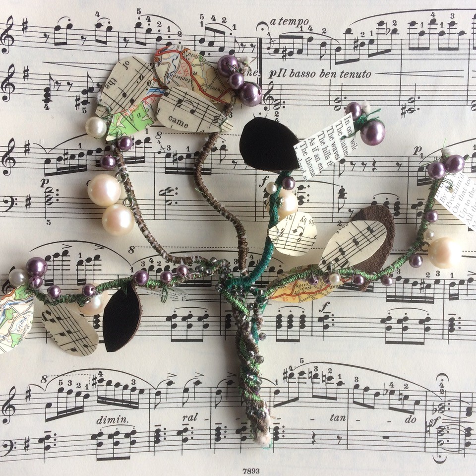 Trees are wonderfully architectural and I have created a 3D tree form with wire. The wire was covered with machine stitching to form branches that were twisted and bent into shape. The branches were twisted together to make a thicker trunk. Leaves were made from sheet music, book pages, maps, and leather. The paper was laminated before cutting. The fruits are pearls of different sizes, and there is some beading on the tree trunk.