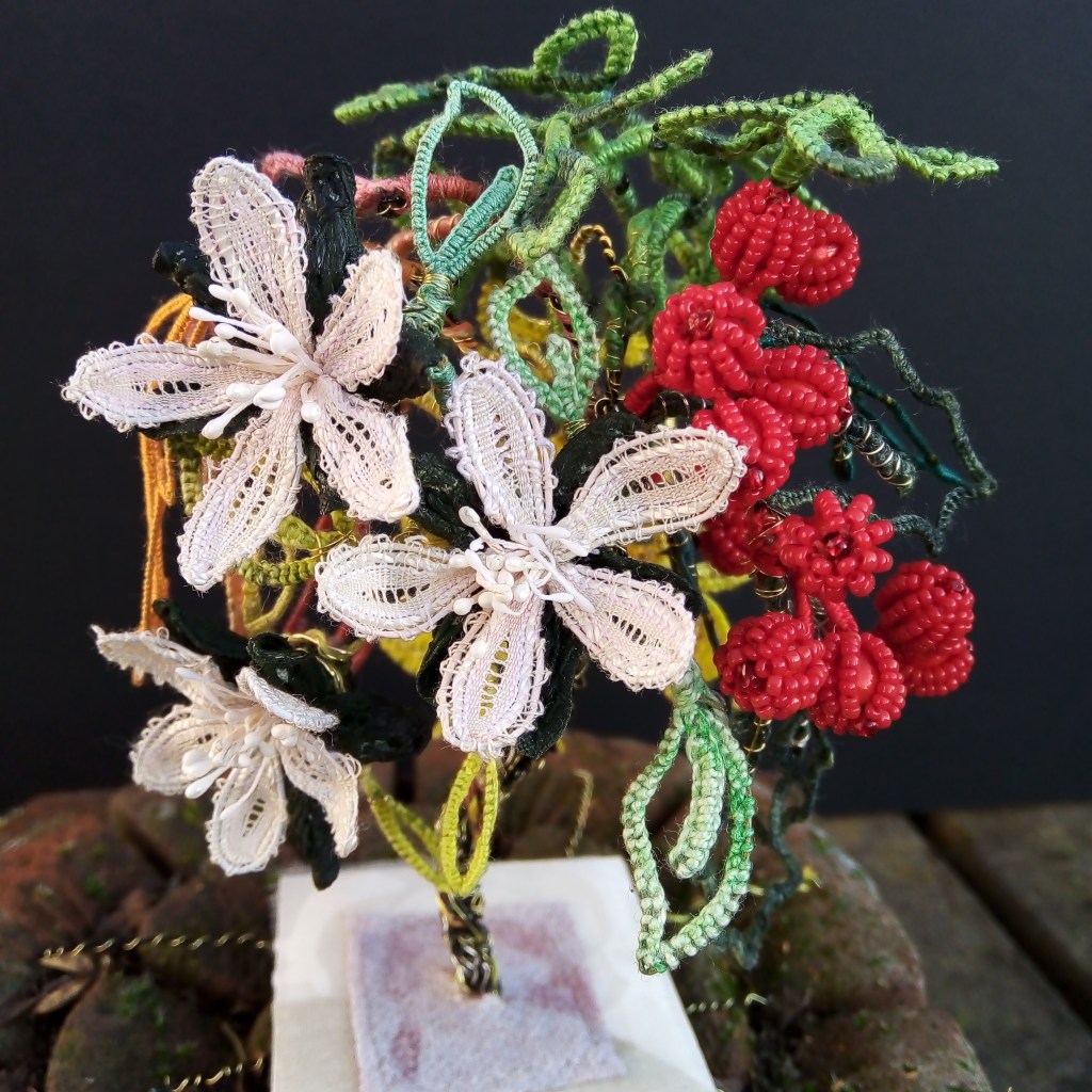 Three dimensional lace tree, the leaves unworked centres, hand dyed threads.