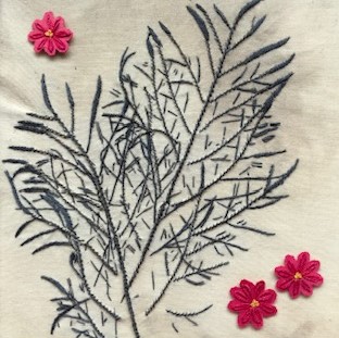 The leaf is an actual print of two Cosmos leaves, over stitched with dark grey stranded cotton with stem stitch, whipping and straight stitches.