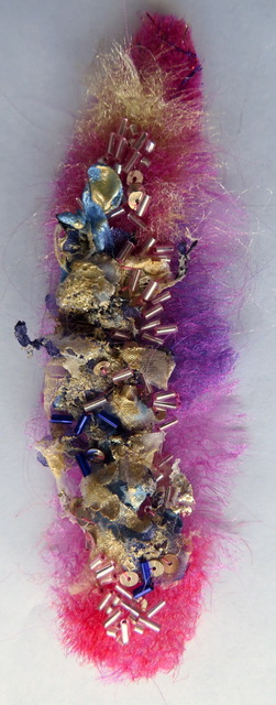Materials: Tyvek, gold mesh, sheer fabrics, acrylic paint, seed beads, sequins and bugle beads. Techniques: needle felting, heat treated, hand embroidery.